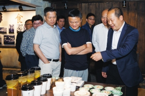 在黄酒小镇规划展示馆,看到展示区内摆放着黄酒棒冰、黄酒奶茶、黄酒巧克力、酒酿酸奶等一系列黄酒衍生产品,马云忍不住拿起来逐一品尝,连说了几个“真不错”。他说,先前自己已品尝过黄酒棒冰,但是黄酒奶茶、黄酒巧克力、酒酿酸奶还是第一次见到,口味很好,想法也很有创意。