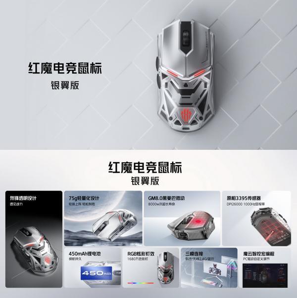 红魔电竞鼠标银翼版的透明银翼配合氘锋镂空设计带来纵深空间感十足的效果,搭配业界最高水准的配置,瞬间拉满电竞氛围。