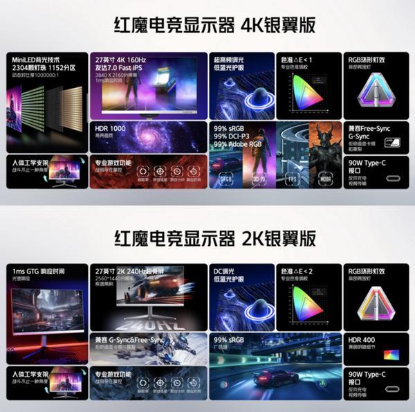 红魔此前推出的全球首款红魔电竞显示器4K版拥有160Hz刷新率、Mini LED 背光技术等高端配置,上市之后获得了用户和媒体的一致好评。27英寸红魔电竞显示器4K银翼版则延续了其顶级功能配置,并采用了氘锋银翼版配色,可完美兼顾游戏、设计、工作等需求。红魔电竞显示器2K银翼版则拥有240Hz极限高刷,适合追求高帧率的游戏玩家。
