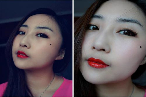 女生右边脸颊腮上有颗痣 ;